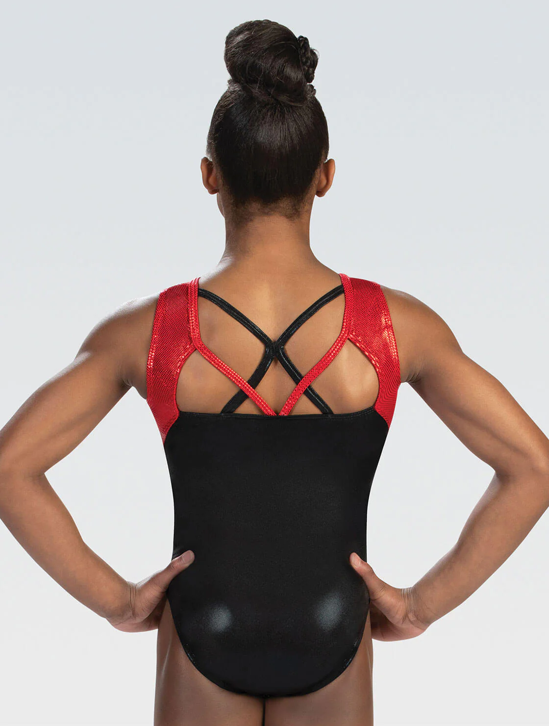 STYLE: Scoop neck leotard.GREAT DETAILS: Scoop neck leotard in black mystique and red prism featuring red hologram spanglezâ„¢.